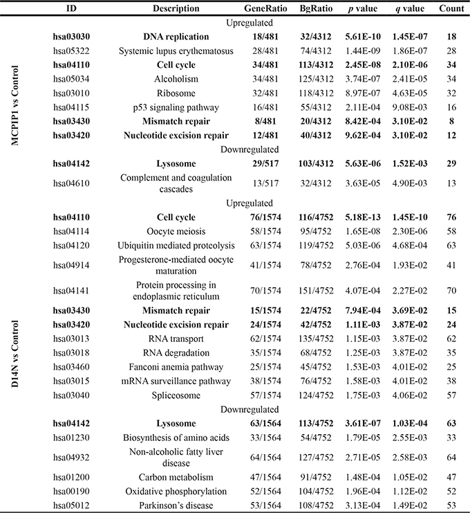 KEGG enrichment analysis shows 8 upregulated and 2 downregulated pathways in MCPIP1 cells, whereas, 12 upregulated and 7 downregulated pathways were observed in D141N cells (p-adj. < 0.05; Table 1, Supplementary Figure 1, Supplementary Tables 2 and 3). Cell cycle was the top upregulated KEGG pathway, whereas lysosomal regulation was the most downregulated KEGG pathway in MCPIP1 and D141N cells. We additionally analyzed the differentially expressed genes between MCPIP1 and D141N overexpressing cells. GO analysis showed that upregulated genes belonged to 37 BP, 11 MF and 11 CC GO terms, whereas the downregulated genes belonged to 50 BP, 12MF and 20 CC GO terms. KEGG enrichment analysis showed 8 upregulated and 16 downregulated pathways in MCPIP1 cells than in D141N cells. Both GO and KEGG analyses showed that wild-type MCPIP1 downregulated cell cycle, DNA repair and endoplasmic reticulum protein processing (Supplementary Table 4).