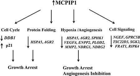 In conclusion, we identified 219 transcripts that are downregulated in MCPIP1 cells, but are unchanged or upregulated in D141N cells that overexpress MCPIP1 that lacks the functional PIN domain. We further validated 15 selected transcripts by qRT-PCR. As shown in Figure 6, MCPIP1 overexpression leads to large scale changes in transcript levels, especially those involved in protein folding, cell cycle progression, hypoxia response, angiogenesis and cell signaling.