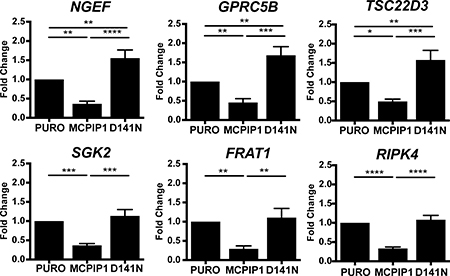 Figure 5: MCPIP1 decreases transcripts of signaling mediators. QRT-PCR analysis of NGEF, GPRC5B, TSC22D3, SGK2, FRAT1 and RIPK4 mRNA levels relative to RPS13 in PURO, MCPIP1 and D141N cells induced with doxycycline for 24 h Graphs represent mean ± SD of three independent experiments. The p-values were estimated by one-way ANOVA followed by Tukey’s HSD test ((* p <0.05; **p <0.01; ***p <0.001; ****p <0.0001).
