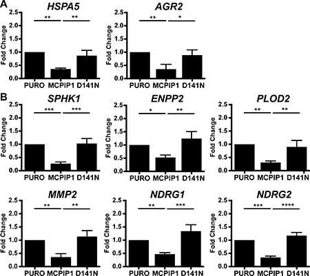 Figure 4: MCPIP1 decreases transcripts of protein folding and hypoxia response genes. (A) QRT-PCR analysis of HSPA5 and AGR2 mRNA levels in PURO, MCPIP1 and D141N cells induced with doxycycline for 24 h. (B) QRT-PCR analysis of SPHK1, ENPP2, PLOD2, MMP2, NDRG1 and NDRG2 mRNA levels in PURO, MCPIP1 and D141N cells induced with doxycycline for 24 h. Transcript levels are normalized to RPS13 mRNA levels as control. Graphs represent mean ± SD of three independent experiments. The p-values were estimated by one-way ANOVA followed by Tukey’s HSD test (* p < 0.05; **p < 0.01; ***p < 0.001; ****p < 0.0001).