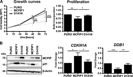 Figure 3: MCPIP1 overexpression decreases growth of Caki-1 cells. (A) Graphical representation of cell viability, proliferation and growth of PURO, MCPIP1 and D141N cells. Cell growth and viability was measured by the MTT assay at 24, 48 and 72 h in the 3 cell lines after induction with doxycycline for 24 h. Cell proliferation was measured by BrdU incorporation for 8 h in the three cell lines after induction with doxycycline for 24 h. (B) Representative western blots show MCPIP1 and p21 expression in PURO, MCPIP1 and D141N cells induced with doxycycline for 24 h. β-Actin is used as a loading control. Histograms show CDKN1A and DDB1 transcript levels relative to RPS13 transcript levels in PURO, MCPIP1 and D141N cells induced with doxycycline for 24 h. Blots represent two out of three identical experiments. Graphs represent mean ± SD from three (B) or four (A) independent experiments. The p-values were estimated by one-way ANOVA followed by Tukey’s HSD tests (*p < 0.05; **p < 0.01; ***p < 0.001; ****p < 0.0001). Note: For the cell growth analysis the two-way ANOVA followed by Tukeys’s independent test was used (* relates to PURO vs. MCPIP1 comparison and # relates to MCPIP1 vs. D141N comparison).