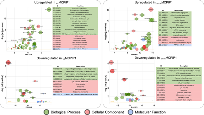 Figure 2: Bubble plot of significantly enriched GO terms in the MCPIP1 vs. PURO and D141N vs. PURO comparative datasets. The differentially regulated genes were based on the cut-off set at adj. p-value of 10-4 and 10-2 for upregulated and downregulated genes, respectively. The y-axis represents the -log10 (p-value) and the x-axis represents the z-score (computed with GOplot R-package). The area of the displayed circles is proportional to the number of genes assigned to the term in the analysis. The threshold indicates adj. p value = 0.05