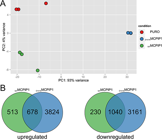 Figure 1: RNA-Seq analysis of global transcriptome changes based on MCPIP1 expression. (A) Principal component analysis (PCA) of RNA-Seq datasets and (B) Venn diagrams show the number of differentially expressed transcripts (adj. P-value < 0.05) in the MCPIP1 and D141N cells relative to the PURO cells (MCPIP1 vs. PURO and D141N vs. PURO datasets). PCA is based on the abundances of all transcripts detected in RNA-Seq analysis.
