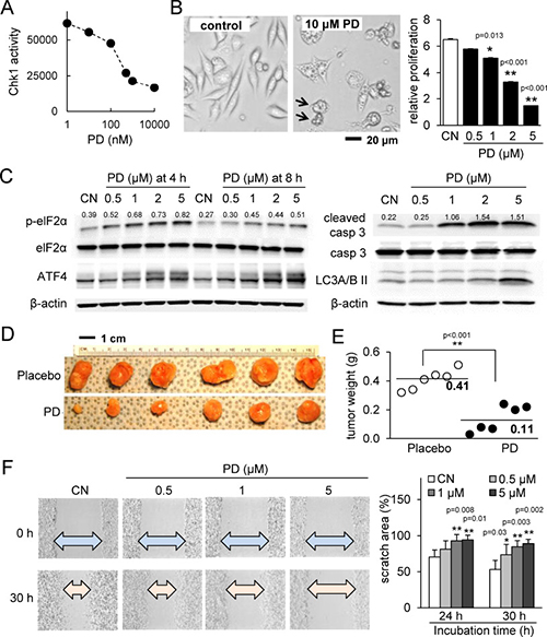 Figure 1: PD407824 suppresses tumor growth and migration. CN = control. (A) Chk1 activity is inhibited by increasing dosages of PD407824. (B) Representative cell images in response to 10 μM PD407824 for 24 h, and relative proliferation of 4T1.2 mammary tumor cells in response to 0.5, 1, 2, and 5 μM PD407824 for 3 days. The arrows indicate cells undergoing apoptosis. (C) Elevation of p-eIF2α and ATF4 protein in response to 0.5-5 μM PD407824 for 4 and 8 h, as well as elevation of cleaved caspase 3 (apoptosis marker) and LC3A/B II (autophagy marker) for 24 h. (D–E) Reduction of tumor size by daily intraperitoneal injection of PD407824 at 2 mg/kg for 3 weeks (N = 6). Mice received injection of 4T1.2 cells (5.0 × 105 cells in 50 μl PBS) at the mammary fat pad. (F) Dose-dependent reduction in cell motility of 4T1.2 cells in response to PD407824 in a scratch assay for 24 h and 30 h.