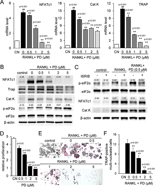 Figure 2: PD407824 inhibits osteoclastogenesis in RAW264.7 pre-osteoclasts. Data are represented as the means ± SD of three independent experiments, in which ## and ** indicate p < 0.01 compared to the control and RANKL groups, respectively. CN = control. (A) Reduction of the mRNA levels of NFATc1, Cathepsin K (Cat K), and TRAP in RANKL-stimulated RAW264.7 cells in response to 0.5–5 μM PD407824 in 24 h. (B) Reduction of the protein levels of NFATc1, TRAP, and Cat K, as well as elevation of the phosphorylation level of eIF2α (p-eIF2α) by 0.5–5 μM PD407824 in 24 h. (C) Effects of 10 μM ISRIB, an inhibitor of eIF2α phosphorylation, on the protein levels of NFATc1 and Cat K. (D) Dose-dependent reduction in relative proliferation of RAW264.7 cells by 0.5 to 5 μM PD407824 for 3 days. (E) Inhibition of TRAP-positive mature osteoclasts by RANKL-stimulated RAW264.7 cells from 0.5–5 μM PD407824 after 4 days. (F) Number of TRAP-positive multi-nucleated cells in RANKL-treated RAW264.7 cells.