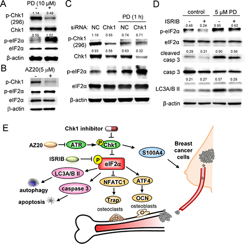 We examined the mechanism of Chk1 inhibitor’s action focusing on phosphorylation of eukaryotic translation initiation factor 2 alpha (eIF2α), stress to the endoplasmic reticulum, S100 proteins, bone remodeling-linked genes, and Ataxia telangiectasia and Rad3 related (ATR) signaling. We have previously shown that upregulation of the phosphorylation of eIF2α by salubrinal and guanabenz decreases proliferation of mammary tumor cells and chondrosarcoma cells [12, 13]. We have also shown that the elevated phosphorylation of eIF2α downregulates nuclear factor of activated T cells (NFATc1), a master transcription factor for development of bone-resorbing osteoclasts [14, 15]. We applied RNA interference and targeted chemical inhibitors to elucidate the signaling relationships between these pathways and Chk1 inhibition.