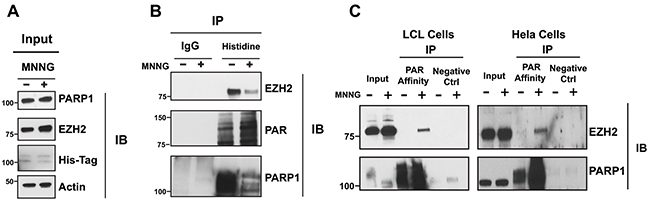 Figure 1: EZH2 interacts with PARP1 and is PARylated after DNA damage induction. (A) Immunoprecipitation of EZH2 with PARP1 under physiological conditions and after induction of DNA damage. His-PARP1 was expressed in HeLa cells by transfection. Cells were treated with 100 uM of the alkylating agent N-methyl-N’-nitro-N-nitrosoguanidine (MNNG) for 10 minutes to induce DNA damage and activate PARP1. Input corresponds to 1/20th of protein extracts from transfected cells used for the tag-construct pulldown. (B) Proteins interacting with EZH2 were analyzed by His pulldown or immunoprecipitated with non-immunogenic IgG (control) followed by western blot analysis with anti-EZH2 (top), anti-PAR (middle) and anti-PARP1 (bottom) antibodies. (C) Immunoprecipitation of EZH2 with PAR-affinity resin after induction of DNA damage. LCLs and HeLa cells were treated with or without 100 uM MNNG for 10 minutes. Cellular protein extracts were immunoprecipitated with a PAR affinity resin or PAR negative control resin and analyzed by western blot with anti-EZH2 and anti-PARP1 antibodies. Input corresponds to 1/10th the amount of cell extracts used for immunoprecipitation.