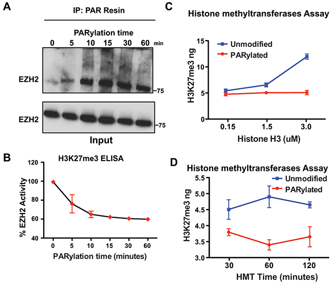 After PARylation, the human EZH2/EED/SUZ12/ RbAp48/AEBP2 Complex (BPS Bioscience) was incubated in 30 mL HMT buffer containing 50 μM Tris, pH 8, 10 μM MgCl2, 10 μM DTT, and 3 μg purified Histone H3 (Active Motif, C110A) with or without 40 μM [S-(5’-Adenosyl)-L-methionine] (SAM) (BPS Bioscience). For western blot analysis of H3K27me3 levels, the reaction was inactivated after 30 minutes by the addition of 2x SDS-PAGE loading buffer followed by SDS-PAGE and immunoblotting. For ELISA analysis of H3K27me3 levels, the reaction was inactivated after 30 minutes by acid extraction of histone H3 following the histone extraction protocol from Abcam. Histone H3 was then quantified by BCA and H3K27me3 levels were measured by Histone H3 trimethyl Lys27 ELISA kit (Active Motif) according to manufacturer’s protocol. For time course experiments, the histone methyltransferase reaction was carried out for either 30, 60 or 120 minutes.