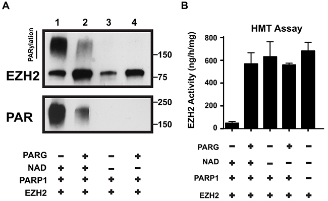 Figure 4: PARG reverses EZH2 PARylation and restores EZH2 enzymatic activity. (A) In vitro PARG assay. EZH2/PRC2 complex and PARP1 were incubated with or without PARG as indicated (Note: NAD+ is required for PARylation). After 1 hour, the reaction was blocked by addition of the PARP inhibitor olaparib and the EZH2/PRC2 complex was incubated with (lanes 2 and 4) or without (lanes 1 and 3) PARG to allow degradation of PAR polymers. After 1 hour, the reaction was stopped by adding Laemmli buffer and the proteins were analyzed by western blot using anti-EZH2 and anti-PAR antibodies. The upper band in the top panel represents PARylated EZH2. PARG activity was confirmed by reduction of PAR smear. (B) In vitro histone methyltransferase (HMT) activity assay. EZH2/PRC2 complex treated as in A) was subsequently assayed for histone methyltransferase activity using an HMT assay kit. The activity of EZH2 under the indicated conditions was calculated based on the amount of H3-K27 converted in the assay. As a control, the activity of EZH2/PRC2 complex alone was also determined. N=3, mean ± SD.