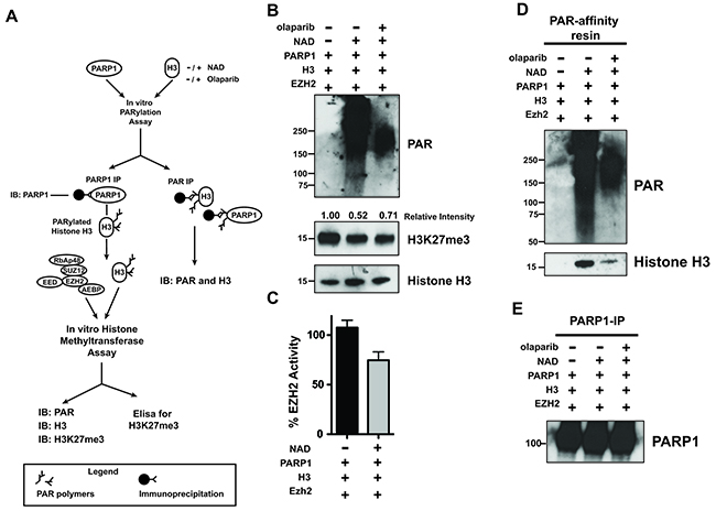 The objective of this study was to test the overall hypothesis that, in response to DNA damage, PARP1 regulates EZH2 activity. We hypothesized that increased PARP activity that occurs during DNA damage causes PARP1 to PARylate EZH2, leading to decreased EZH2 activity and thereby decreased histone methyltransferase (H3K27me) activity. Since PARP1 is also known to PARylate histone H3, the substrate of EZH2, we hypothesized that PARylation of histone H3 may alter the affinity of EZH2 for its substrate. This study uses in vitro and cell-based biochemical methods to evaluate the interactions between PARP1, EZH2 and histone H3, the PARylation status of EZH2 and histone H3, EZH2 histone methyltransferase activity and changes in the affinity of EZH2 for its substrate H3.
