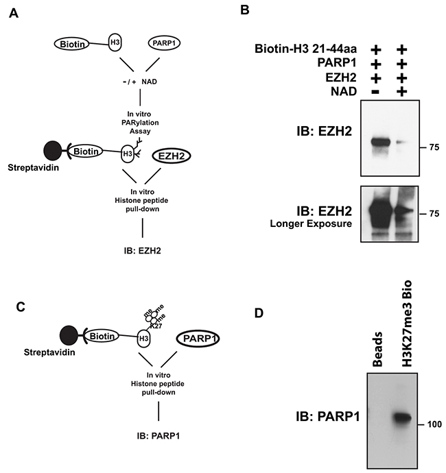 Figure 6: PARylation of histone H3 decreases EZH2 affinity for H3, while methylation of histone H3 has no effect on the ability of PARP1 to interact with histone H3. (A) Schematic of histone peptide pull-down after PARylation. (B) Histone peptide pull-down for EZH2. Synthesized histone H3 peptide, corresponding to residues 21-44 of human histone H3, was conjugated with biotin and incubated with PARP1 in the presence or absence of NAD+ to allow for PARylation. After 1 hour, the reaction was blocked with 250 nM olaparib and the H3 peptide was immunopurified with streptavidin-magnetic beads and subsequently incubated with EZH2/PRC2 complex. After 4 hours, the peptide-coated, streptavidin-conjugated beads were washed to remove unbound proteins and bound proteins were analyzed by western blot using an anti-EZH2 antibody. PARylation of the peptide was confirmed by western blot using an anti-PAR antibody. Top panel shows short film exposure; lower panel longer film exposure. (C) Schematic of histone peptide pull-down after in vitro histone methyltransferase assay. (D) Histone peptide pull-down assay for PARP1. Synthesized histone H3 peptide containing tri-methylated lysine 27 was conjugated with streptavidin magnetic beads followed by incubation with purified PARP1. After 4 hours, the peptide-coated, streptavidin-conjugated beads were washed to remove unbound proteins and bound proteins were analyzed by western blot using an anti-PARP1 antibody.