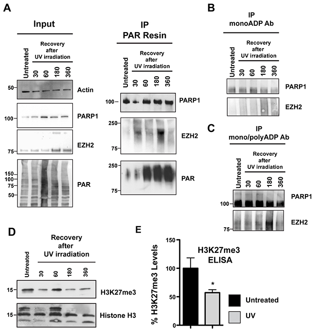Figure 8: EZH2 PARylation decreases global H3K27me3 levels after DNA damage. (A) PARylation of EZH2 after DNA damage by UV radiation. HeLa cells were irradiated with UVA and UVB for 2 minutes and then recovered in media. PARylated proteins were pulled down at the indicated recovery times using PAR-resin and analyzed by western blot using anti-PARP1, anti-EZH2 and anti-PAR antibodies. The shift of EZH2 to a higher molecular weight isoform indicates its PARylation. EZH2 PARylation increases and reaches a maximum at 3h after the initial treatment with UV. Input corresponds to 1/20th the amount of protein extract. (B and C) HeLa cells were treated as above and proteins were pulled down using either an anti mono-ADP-ribose antibody or an anti mono/poly-ADP-ribose antibody. Immunoprecipitated proteins were then analyzed by western blot with anti-EZH2 and anti-PARP1 antibodies. The western blot is representative of at least three independent experiments. Untreated cells served as control. (D) Histones were extracted from HeLa cells treated as described above. H3K27me3 levels were analyzed by western blot with an anti-H3K27me3 antibody or anti-histone H3 as control. (E) Quantification of H3K27me3 levels after UV irradiation-induced DNA damage. HeLa cells were exposed to UV as described in A) and recovered in media. After 3 hours, histones were purified and assessed for H3K27me3 levels by ELISA. The level of K27 methylation under the indicated conditions were calculated based on the amount of H3-K27 converted in the assay, divided by the amount of total histones loaded. Data were normalized to the untreated and expressed as % of H3K27me3. Data were N=3, mean ± SD. Statistically significant differences between experimental conditions and control samples were determined by Student’s t test.