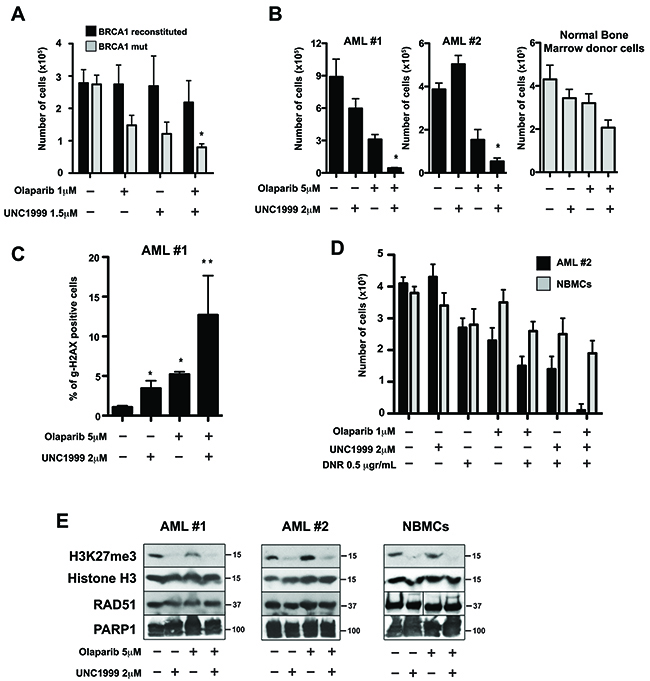 Figure 9: EZH2 inhibitor UNC1999 enhanced PARP1 inhibitor olaparib-mediated synthetic lethality in BRCA-deficient cell lines and acute myeloid leukemia (AML) primary cells. (A) BRCA1-mutated and BRCA1-reconstituted MDA-MB-436 human breast carcinoma cells were treated with or without the PARP1 inhibitor olaparib in the presence or absence of the EZH2 inhibitor UNC1999 at the indicated concentrations. After 4 days, cell count/viability was determined by Trypan blue exclusion using a Bio Rad TC20 Automated Cell Counter. Results show mean ± SD of living cells. N=3. *p<0.05 compared to individual treatment using Student t test. (B) Lin-CD34+ AML primary cells from two patients and from healthy bone marrow donor (NBMCs) were treated with 2μM UNC1999, 5 μM olaparib, or were left untreated. After 4 days, live cell number was determined by Trypan blue exclusion using a Bio Rad TC20 Automated Cell Counter. Results show mean × SD number of live cells. N=3. *p<0.05 compared to individual treatment using Student t test. (C) Lin-CD34+ AML primary cells (patient #1) were treated with olaparib and UNC1999 as indicated. After 48 hours, DNA damage was evaluated by measuring the percentage of γ-H2AX-positive Lin-CD34+ AML#1 cells by flow cytometry. Data are mean × SD. N=3. *p<0.001 in comparison to Control; **p<0.05 in comparison to UNC1999 or olaparib treatment. (D) Lin-CD34+ AML #2 cells and NBMCs were isolated as in B) and treated with UNC1999, 0.5 μg/μl DNR, 1 μM olaparib, the indicated drug combinations, or were left untreated. After 4 days living cells were determined by Trypan blue exclusion assay. Data are mean × SD. N=3; *p<0.01 compared to individual/dual treatment using Student t test. (E) Proteins were extracted from Lin-CD34+ AML cells and NBMCs after 2 days of treatment with the indicated drug combination and analyzed by western blot with antibodies specific for H3K27me3, histone H3, RAD51 and PARP1 proteins. Blots are representative of three independent experiments.