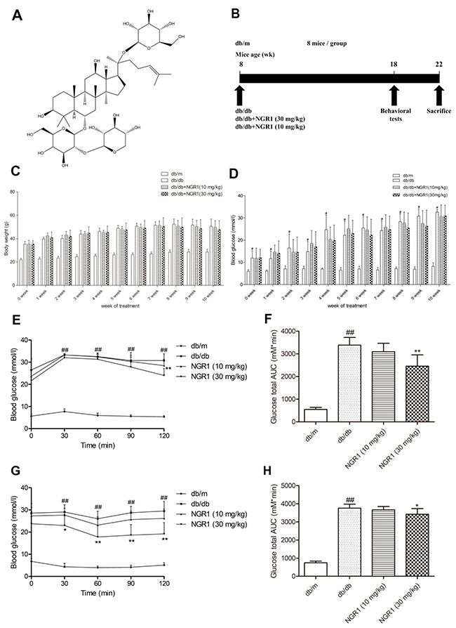 Figure 1: NGR1 improves insulin resistance in db/db mice. (A) Chemical structure of NGR1; molecular weight is 933; molecular formula is C47H80O18. (B) Schematic diagram showing the timeline scheme of the animal experiments in vivo. (C) Body weights of mice in each group during 10 weeks of treatment. (D) Blood glucose level of mice in each group during 10 weeks of treatment. (E) Curve of blood glucose levels in OGTTs. (F) Glucose total AUC in OGTTs. (G) Curve of blood glucose levels in ITTs. (H) Glucose total AUC in ITTs. All data are represented as means ± SD for 8 mice in each group. ## P < 0.01, compared with the db/m-group; ** p < 0.01, * p < 0.05, compared with the db/db-group.