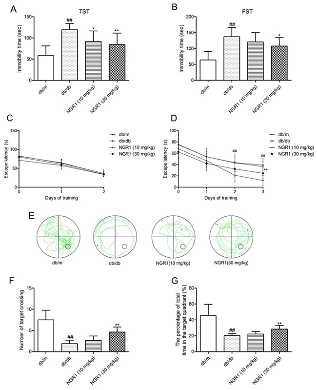 Figure 2: NGR1 attenuates depression-like behaviors and memory impairment in db/db mice. In the Morris water maze (MWM) test, day 0 means performance on the first trial, and subsequent points indicate average of all daily trials. (A) Immobility time in TST. (B) Immobility time in FST. (C) Escape latency of the two-day visible-platform test. (D) Escape latency of the three-day hidden-platform test. (E) Representative swim paths during the probe test. (F) Percentage of total time spent in target quadrant in the probe trial. (G) Number of target crossings in the probe trial. Values are represented as means ± SD for 8 mice in each group. ## P < 0.01, compared with the db/m-group; ** p < 0.01, * p < 0.05, compared with the db/db-group.