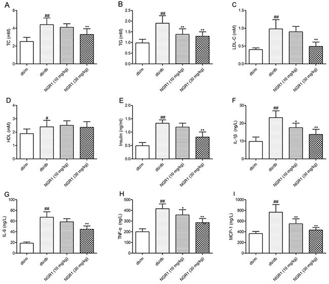 Figure 3: NGR1 influences lipids, insulin, and cytokines in plasma of db/db mice. (A) Levels of TC in plasma samples of mice after 10 weeks of treatment. (B) Levels of TG in plasma samples of mice after 10 weeks of treatment. (C) Levels of LDL-C in plasma samples of mice after 10 weeks of treatment. (D) Levels of HDL-C in plasma samples of mice after 10 weeks of treatment. (E) Levels of insulin in plasma samples of mice after 10 weeks of treatment. (F) Levels of IL-1β in plasma samples of mice after 10 weeks of treatment. (G) Levels of IL-6 in plasma samples of mice after 10 weeks of treatment. (H) Levels of TNF-α in plasma samples of mice after 10 weeks of treatment. (I) Levels of MCP-1 in plasma samples of mice after 10 weeks of treatment. Values are represented as means ± SD for 8 mice in each group. ## P < 0.01, # P < 0.05, compared with the db/m-group; ** P < 0.01, * P < 0.05, compared with the db/db-group.