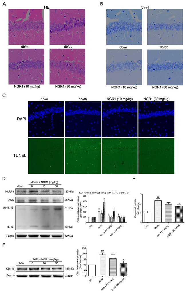 Figure 4: NGR1 exerts neuroprotective effects by inhibiting NLRP3 inflammasome activation in hippocampus of db/db mice. (A) H&E staining in the hippocampal CA1 region for each group. (B) Nissl’s staining in the hippocampal CA1 region for each group. (C) TUNEL staining in the hippocampal CA1 region for each group. (D) Representative protein bands and Western blot analysis of NLRP3, ASC and IL-1β (P31 and P17) in the hippocampus of each group. (E) Caspase-1 activity in the hippocampus of each group. (F) Representative protein bands and Western blot analysis of CD11b in hippocampus of each group. All data are represented as means ± SD for 3 mice in each group. ## P < 0.01, # P < 0.05, compared with the db/m-group; ** p < 0.01, * p < 0.05, compared with the db/db-group.