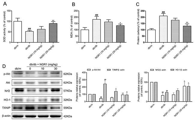 Figure 5: NGR1 inhibits oxidative stress by up-regulating the Akt/Nrf2/HO-1 pathway in the hippocampus of db/db mice. (A) SOD activity in the hippocampus of each group. (B) MDA levels in the hippocampus of each group. (C) Protein carbonyl levels in the hippocampus of each group. (D) Representative protein bands and Western blot analysis of Akt, p-Akt, Nrf2, HO-1, and TXNIP in the hippocampus of each group. Values are represented as means ± SD for 3 mice in each group. ## P < 0.01, compared with the db/m-group; ** P < 0.01, * P < 0.05, compared with the db/db-group.