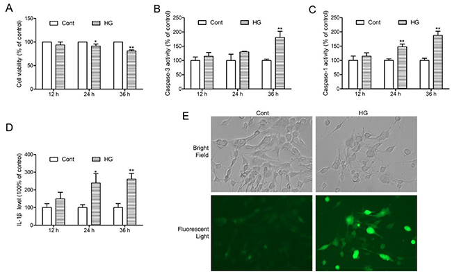 Figure 6: HG-induced injury, NLRP3 inflammasome activation and ROS production in HT22 hippocampal neurons. (A) Followed by incubation with HG (50 mM vs control: 25 mM) at different time points (12, 24 and 36 h), and cell viability was detected by MTT assay. (B) Caspase-3 activity in HT22 hippocampal neurons after HG treatment at the indicated time periods. (C) Caspase-1 activity in HT22 hippocampal neurons after HG treatment at the indicated time periods. (D) IL-1β level in HT22 hippocampal neurons after HG treatment at the indicated time periods. (E) Intracellular ROS generation in HT22 hippocampal neurons after HG treatment for 36 h was visualised under a fluorescence microscopy. Values are represented as means ± SD from three independent experiments. ** P < 0.01, * P < 0.05, compared with the control-group.