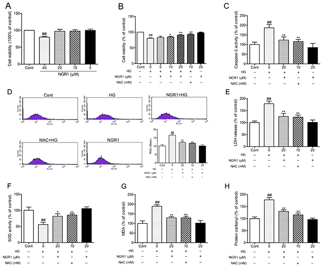 The potential neuroprotective effects of NGR1 on HT22 cells against HG-induced injury were evaluated by measuring cell viability, caspase-3 activity, and lactate dehydrogenase (LDH) release. Although high concentrations of NGR1 (40μM) showed certain cytotoxicity in HT22 cells that underwent incubation for 36 h, no obvious difference in cell viability was observed among the groups at low concentrations (5, 10, and 20 μM) and the control group (P > 0.05) (Figure 7A). N-acetyl-L-cysteine (NAC, 10 mM), a classical anti-oxidant, was used as a positive control [32]. As shown in Figure 7B, HT22 cells subjected to HG (50 mM) for 36 h showed significantly decreased cell viability (P< 0.01), and incubation with NGR1 obviously inhibited this decrease in a concentration-dependent manner (5, 10, and 20μM) (P< 0.05, P< 0.01). Moreover, HG treatment observably increased caspase-3 activity and LDH leakage in HT22 cells (P < 0.01) (Figure 7C, and 7E). And incubation with NGR1 (20 μM) observably decreased the caspase-3 activity and LDH leakage compared with the model group (P < 0.01). No obvious difference in cell viability, caspase-3 activity and LDH leakage was observed between the group treated with NGR1 (20 μM) alone and control group (P > 0.05). ROS is a mediator of glucose toxicity in HT22 neuronal cells [27]. The intracellular ROS level was detected by measuring carboxy-H2DCFDA fluorescence. As shown in Figure 7D, HG treatment observably increased intracellular ROS level in HT22 cells compared with the control group (P < 0.01). Compared with the model group, incubation with NGR1 (20 μM) obviously decreased intracellular ROS level (P < 0.01). These results showed that NGR1 treatment provides protection against HG-induced cell injury by inhibiting ROS production.