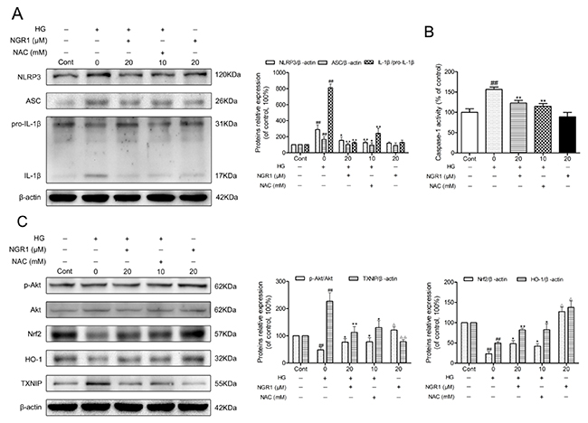 Figure 8: NGR1 activates the Akt/Nrf2/HO-1 pathway, and inhibits NLRP3 inflammasome activation in HG-induced HT22 hippocampal neurons. (A) Representative protein bands and Western blot analysis of NLRP3, ASC, and IL-1β in hippocampal neurons. (B) Caspase-1 activity in hippocampal neurons. (C) Representative protein bands and Western blot analysis of Akt, p-Akt, Nrf2, HO-1, and TXNIP in hippocampal neurons. Values are represented as means ± SD from three independent experiments. ## P < 0.01, △△ P < 0.01, △ P < 0.05 compared with the control-group; ** P < 0.01, * P < 0.05, compared with the model-group.