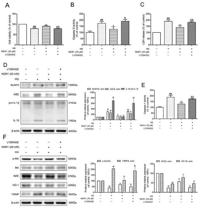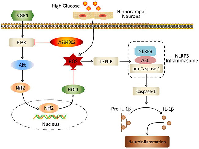 To verify the effect of the Akt/Nrf2 pathway in the inhibition of oxidative stress and NLRP3 inflammasome activation in NGR1 treatment, the PI3K inhibitor LY294002 was used in experiments. As shown in Figure 9D, and 9E, the neuroprotective effect and inhibition of NLRP3 inflammasome activation of NGR1 were abolished by LY294002. Furthermore, LY294002 significantly decreased phosphorylated Akt, Nrf2 translocation, and HO-1 expression levels but TXNIP expression levels in HG- and NGR1-co-treated HT22 cells (P < 0.05) (Figure 9F). Most importantly, PI3K inhibitor LY294002 abolished the beneficial effect of NGR1 on the neuron injury in HG-induced HT22 cells (Figure 9A, 9B, and 9C). These results indicated that NGR1 exerts neuroprotective effects by activating the Akt/Nrf2/HO-1 pathway.