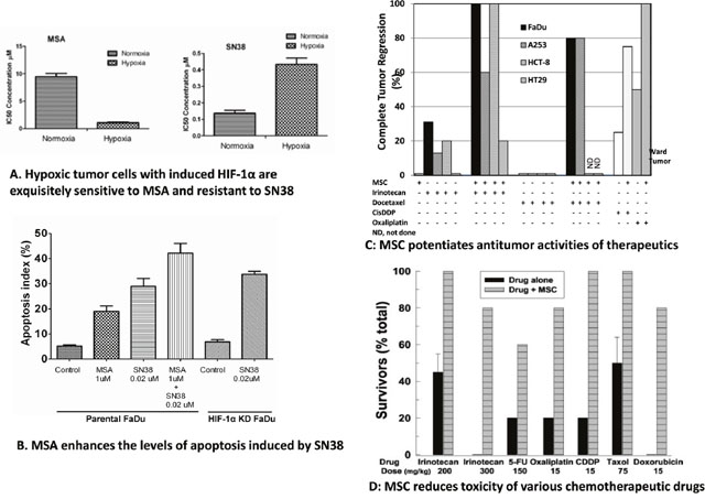 Figure 2: Differential in vitro effects of MSA and SN38 in hypoxic cells expressing HIF-1α and in normoxic cells with no detectable HIF1α protein expression (A). Effects of MSA on the level of apoptosis induced by MSA and SN38 in hypoxic FaDu tumor cells expressing HIF1α, and, in HIF-1α shRNA knockdown FaDu cells treated with SN38 alone (B). Effects of MSC on the antitumor activity of anticancer drugs in head and neck FaDu and A253; colorectal HCT8 and HT29 xenografts, and, in rats bearing Ward colon tumors (C). Effects of MSC on the toxicity induced by lethal doses of anticancer drugs (D). CR, complete tumor response with no evidence of tumor relapse at 3 months.