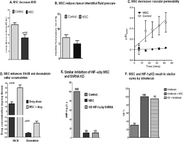 Figure 3: Pleiotropic effects of MSC. Effects of MSC on TME in FaDu xenografts: a reduced microvessel density (A, MVD) along with a reduced tumor interstitial pressure (B) and an increased vessel normalization effect as reflected by a reduced vascular permeability [3] compared with the untreated (C) resulting in an increased drug accumulation in tumors (D). Inhibition of HIF-1α by MSC was similar to the one seen with HIF-1α knockdown ShRNA (E) and the effect of MSC in the combination therapy with irinotecan mimicked the treatment response seen with irinotecan and HIF1α knockdown shRNA (F) [8].