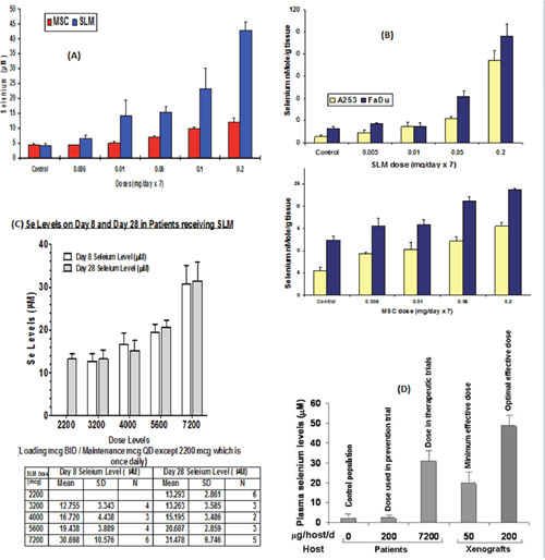 Figure 4: Plasma and tumor cells Se concentrations derived from the administration of therapeutic doses of MSC or SLM in mice and in plasma of patients treated with SLM. (A) Total plasma Se level in mice after oral doses of MSC or SLM. (B) Intra tumor Se concentration 2h after 7 days of SLM or MSC [131]. (C) Plasma Se levels on day 8 and day 28 in patients receiving SLM [27, 28]. (D) Plasma Se levels in patients treated with SLM in the therapeutic trial reached levels higher than the minimal effective dose needed in mice for therapeutic augmentation with anticancer drugs and is significantly higher than the Se levels in untreated population or with SLM dose used in the prevention trial [35, 40].