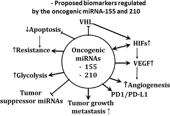 The altered expression of specific types of miRNAs is associated with therapeutic resistance and thus may serve as cancer biomarkers. Redova et al reported that in 35 ccRCC tumors, compared with 10 non-tumor kidney tissues, miRNA 210 and 155 levels were 5.99 and 4.57 fold higher, respectively [115]. miRNAs are master regulators of cell stemness, cancer metastasis and drug resistance [116]. miRNA 210 is inversely correlated with disease-free survival and overall survival of patients with NSCLC. miRNA 155 and 210 have been identified as VHL-regulated miRNA, activated by HIF1α and associated with drug resistance [117], and as prognostic and diagnostic biomarkers for overall survivor in glioblastoma following surgery [118]. miRNA 155 also represses a ubiquitin ligase that promotes degradation of NF-k-β family transcription factor c-Rel. An upregulated miRNA 155 modulates T-cell proliferation responses by targeting cytotoxic T lymphocyte-associated antigen 4 [119]. Based on published data, oncogenic miRNA 155 and 210 seem to function as pleiotropic regulators of immunologic and molecular biomarkers associated with therapeutic resistance in cancer cells.