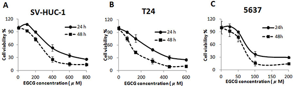 Figure 1: Cytotoxicity of EGCG on normal bladder epithelium SV-HUC-1 (A) and bladder cancer T24 (B) and 5637 (C) cells, after 24 and 48 h incubation. Data were expressed as mean ±SD.
