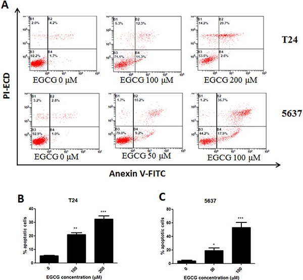 Figure 2: Induction of apoptosis on T24 and 5637 cells by EGCG. (A) Flow cytometry images. (B–C) Quantitative analysis of the percentage of apoptotic cells of EGCG on T24 (B) and 5637 (C) cells after 24 h incubation .The percentage of total apoptotic cells was defined as the sum of early and late apoptotic cells. Data were presented as mean + SD (n = 3). *p < 0.05, **p < 0.01 and ***p < 0.001, as compared with untreated control.