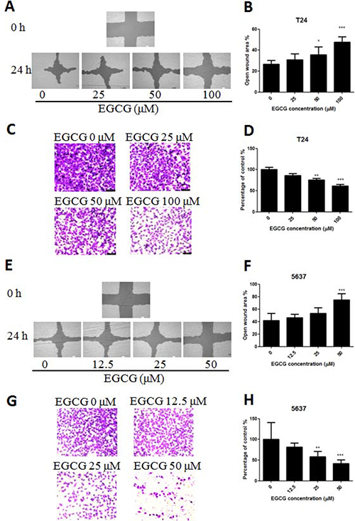 Figure 3: Effect of EGCG on T24 and 5637 cell migration and invasion activities. (A, E) Representative images of the wounded cell monolayers of T24 (A) and 5637 (E) cells. (B, F) Quantitative analysis of the anti-migration activity of EGCG on T24 (B) and 5637 (F) cells after 24 h incubation. Data were expressed as the percentage of open wound area from baseline cultures without treatment. (C, G) Representative images of the stained T24 (C) and 5637 (G) cells. (D, H) Quantitative analysis of the anti-invasion activity of EGCG on T24 (D) and 5637 (H) cells. Data were presented as mean + SD (n = 3). *p < 0.05, **p < 0.01 and ***p < 0.001, as compared with untreated control.