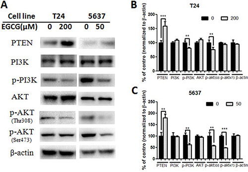 Figure 5: Effect of EGCG on protein expression of PI3K/AKT signaling pathway. (A) Representative images of western blot of proteins after treated with EGCG in T24 and 5637 cells. (B–C) Statistical analysis of PTEN, PI3K, phosphorylated PI3K, AKT, phosphorylated AKT (Thr 308), phosphorylated AKT (Ser 473) and β-actin protein expressions in T24 (B) and 5637 (C) cells after EGCG treatment. Data were showed as mean + SD (n = 3). **p < 0.01 and ***p < 0.001, as compared with untreated control.