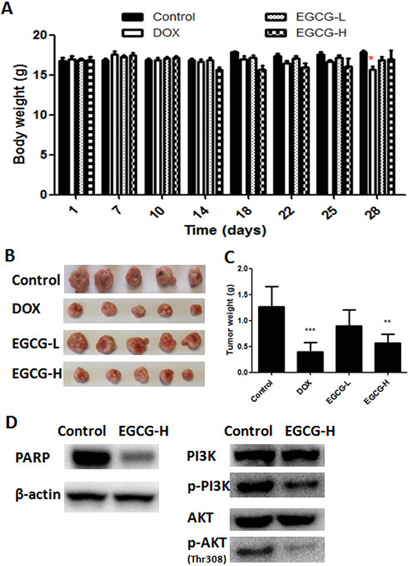 To investigate the activity of EGCG on tumor growth in vivo, a subcutaneous tumor model in nude mice was employed, in which cells were injected into the subcutis of BALB/c nude mice. It was observed that no significant body weight loss was found in EGCG-treated groups during the treatment, but significant body weight loss was found in positive control DOX group (Figure 6A). The tumor growth was inhibited in EGCG and DOX treatment groups, and EGCG-H and DOX decreased the tumor weight significantly by 51.2% and 63.8%, respectively (Figure 6B–6C). Besides, tumors were excised from nude mice to detect the protein expression. As shown in Figure 6D, treatment of EGCG (100 mg/kg) in nude mice resulted in obviously inhibition of phosphorylated PI3K and AKT, and activated PARP, this results were in line with the findings in vitro.
