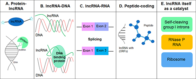 Figure 1: LncRNAs interact with other molecules such as proteins, DNA, RNA and metal ions to form proper tertiary structures (RNA is negatively charged) and exert their functions. (A) LncRNAs can display complex secondary and tertiary structures that offer multiple binding sites for other molecules. (B) LncRNAs can bind to genomic DNA elements, such as gene promoter regions, and regulate gene transcription. (C) LncRNAs can bind to other RNAs and are involved in the regulation of mRNA splicing, editing, subcellular distribution and stability. (D) LncRNAs with short open reading frames (ORFs) code peptides. Both mRNAs and lncRNAs play dual roles as protein/peptide-coding and non-coding RNAs. (E) Catalytic RNAs (ribozyme) such as self-cleaving group 1 introns, RNase P RNA, and the ribosome, play an important role in various biological processes including RNA processing and protein synthesis.