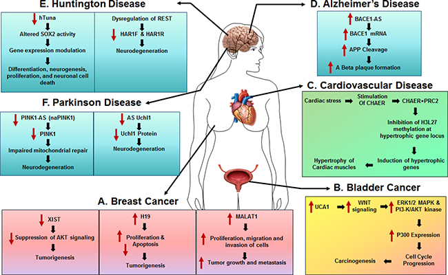 The role of lncRNAs in the regulation of cellular processes and disease progression is gaining attention. While lncRNAs are known to play pivotal roles in maintaining cellular and organismal homeostasis, dysregulation of their expression during the onset and development of various diseases has often been implicated in the regulation of a wide array of genes including those involved in metabolism, cell death, angiogenesis and metastasis. LncRNA-mediated regulation of disease pathogenesis (Table 1) thus represents an evolving area of research that has ramifications for the identification of potential therapeutic targets for various diseases, including cancers and neurodegenerative disorders, for which, currently there exists no cure. Several elegant reviews have recently highlighted and described the role of lncRNAs in colorectal cancer [54, 55], prostate cancer [56–58] and rheumatic diseases [59]. Herein, we briefly summarize the latest findings on the role of lncRNAs in breast cancer, bladder cancer, cardiovascular and CNS diseases.