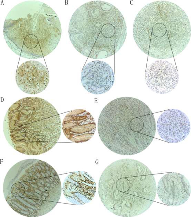 Figure 2: IHC staining of p27 protein in DTCs and adjacent non-tumorous tissues. Cytoplasmic and/or nuclear staining was observed for p27 protein. (A) A paracancerous esophagus tissue showed a high p27 protein expression (magnification: ×100 (upper) and ×400 (lower)); (B) A esophagus adenocarcinoma tissue showed a low p27 protein expression (magnification: ×100 (upper) and ×400 (lower)); (C) A esophagus squamous cell carcinoma tissue showed a low p27 protein expression (magnification: ×100 (upper) and ×400 (lower)); (D) A paracancerous gastric tissue showed a high p27 protein expression (magnification: ×100 (left) and ×400 (right)); (E) A gastric cancer tissue showed a low p27 protein expression (magnification: ×100 (left) and ×400 (right)); (F) A paracancerous colorectal tissue showed a high p27 protein expression (magnification: ×100 (left) and ×400 (right)); (G) A colorectal cancer tissue showed a low p27 protein expression (magnification: ×100 (left) and ×400 (right)).
