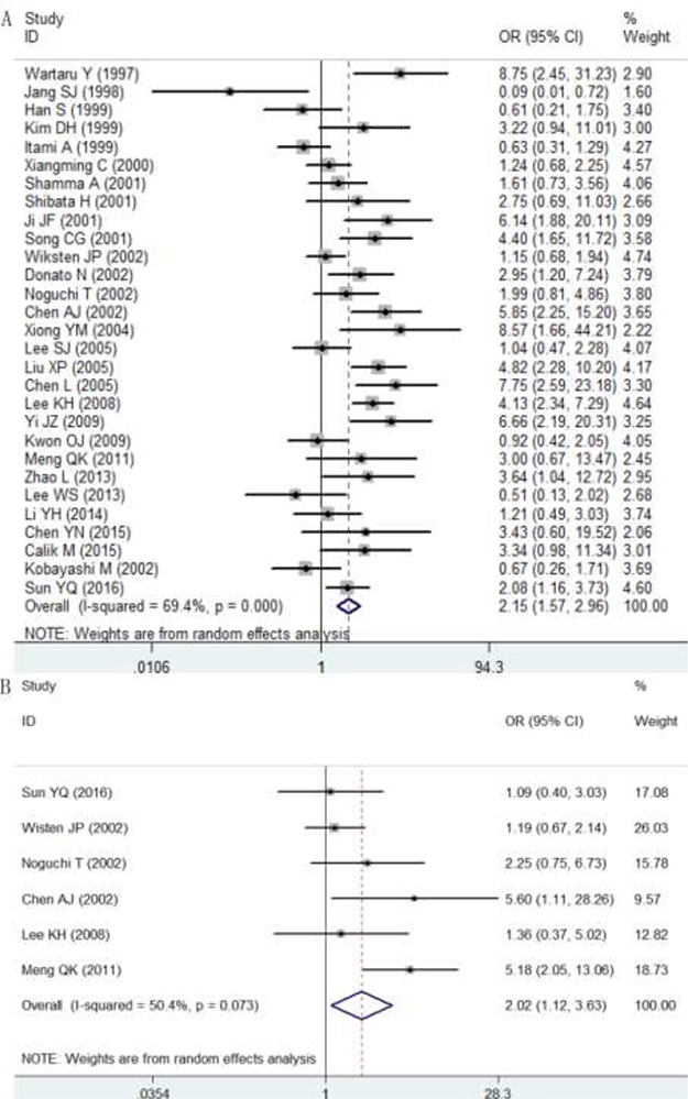 A comprehensive and systematic literature search was conducted in 10 online databases, including Wiley Online Library, Web of Science, Cochrane Central Register of Controlled Trials, EMBASE, PubMed, Chinese CNKI, Chong Qing VIP, China Biology Medicine disc, CBM and Wan Fang (with an upper date limit of August 15, 2017), using the following strategy: (malignan* OR cancer OR tumor OR tumour OR neoplas* OR carcinoma OR adenocarcinoma) AND (digestive OR gastrointestinal OR gastric OR stomach OR esophageal OR esophagus OR gut OR intestinal OR colorectal OR colonic OR rectal OR colon OR rectum) AND (p27KIP1 OR KIP1 OR MEN4 OR MEN1B p27 OR CDKN4 OR “cyclin-dependent kinase inhibitor 1B” OR “cyclin dependent kinase inhibitor 1B” OR CDKN1B).