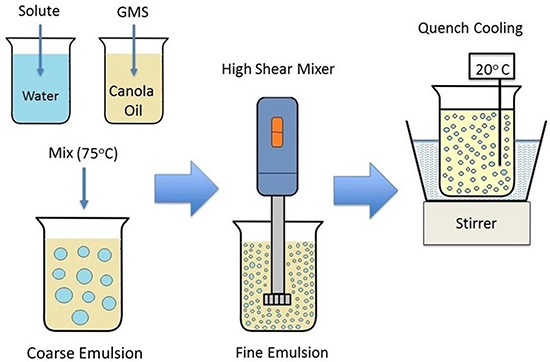 GMS-stabilized Pickering emulsions (GMS-MSPE or MSPE) were prepared using a formulation method as illustrated in Figure 1. An oil phase was prepared by mixing the Pickering stabilizer (GMS) with canola oil to give a concentration of 4 wt% GMS in oil. An aqueous phase was prepared by mixing the solute to be encapsulated (sodium chloride, sodium citrate or OP) with distilled water at a concentration of 4 wt% solute in water. Both mixtures were warmed separately to 75° C to melt the GMS. A coarse emulsion was then produced by adding the aqueous (dispersed) phase to the oil (continuous) phase to yield an emulsion containing 80 wt% oil phase and 20 wt% aqueous phase. The stirrer speed was increased to 1000 rpm to produce a W/O emulsion, and the temperature was maintained at 75° C.