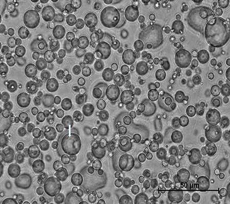 Figure 2: Micrograph of MSPE. Mean droplet size was 10 μm. Dimpled surface on all of the emulsion droplets such as the one highlighted with the arrow is evidence for GMS crystallization on the droplet surface.