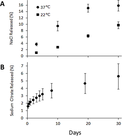 Figure 3: Release profiles. (A) Sodium chloride at 22 and 37° C over 30 day period to simulate ambient and physiological conditions, respectively. Results are given for solute release as a percent of initial loading of solute in the emulsion. (B) Sodium citrate over 30 day period as a percent of initial loading of solute in the emulsion.