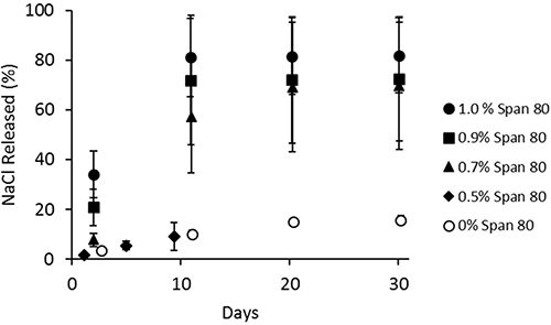 Formulations containing the nonionic surfactant sorbitan monooleate, Span 80 were prepared to examine the impact of oil phase amphiphiles on GMS-based MSPE emulsion stability and release behavior. MSPEs, as described, were prepared with NaCl as active, but with Span 80 in oil added following emulsification and solidification of the GMS. Blank formulations containing 1% Span 80 were prepared to act as a control. The release profiles for formulations containing Span 80 as emulsion destabilizer are shown in Figure 4.