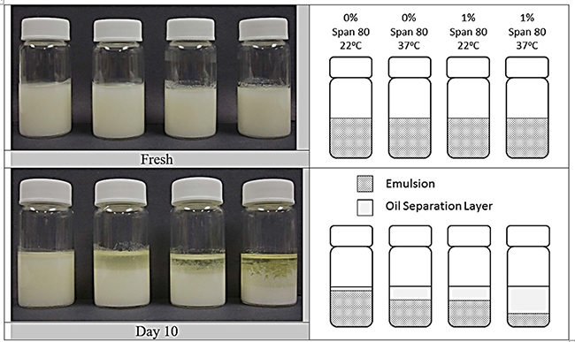 Visual examination of MPSE showed emulsion instability as a mechanism for solute release. Visual phase separation was not evident as shown in Figure 5 for emulsions without Span 80 present (upper panel), but sharply evident after ten days for emulsions in the presence of Span 80 (lower panel). As well, phase separation was more strongly evident at 37° C compared to 22° C. Phase separation appeared consistent with the increased rate of solute release as presented in Figure 4 for NaCl release in the presence of Span 80 and strongly suggested that emulsion droplet flocculation and coalescence were driving the physical breakdown of the emulsion.