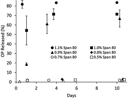 The release profiles of OP from MSPE-stabilized emulsions in the presence of varying amounts of Span 80 are shown in Figure 8. Release profiles showed the minimal release of OP over ten days at Span 80 concentrations up to 0.8%. Beyond this critical concentration, sharp increases in release rates were observed, to an extent dependent on the Span 80 concentration. Between 4 and 5 days, release rates followed a rapid decay and plateauing as most OP had been released. At Span 80 concentrations below 0.8%, the release profile was monitored over 30 days, with no changes in the slopes of the release profiles observed. The entire OP released after 30 days was similar to the amounts shown in the absence of Span 80 in Figure 7.