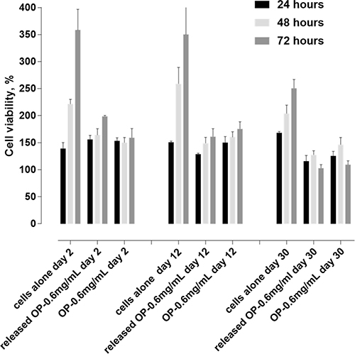 Figure 9: PANC-1 cell viability over 72 h, based on WST-1 assay following exposure of cells to OP released from MPSE at 2, 12 and 30 days. Results are grouped into clusters of 3 bars for each time point of release. The first bar in each cluster represents cells exposed to added water plus media, to the same dilution extent as with samples containing OP supernatant. The second bar represents cells exposed to OP released from MSPE diluted to 0.6 mg/mL OP, and the third bar represents cells exposed to the fresh OP, also at 0.6 mg/mL. Cell viability in all cases is as a percent, in comparison to untreated, undiluted cells at time zero.