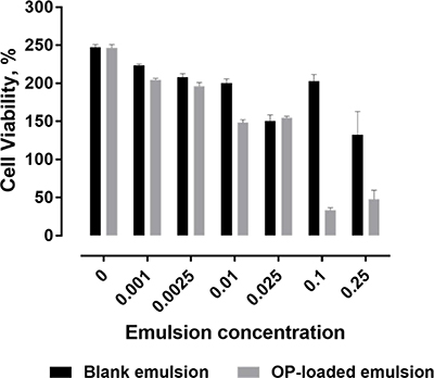 Figure 10: Cell viability determined by WST-1 assay, following 72 h exposure of PANC-1 to OP-loaded MSPE or blank-MSPE, as a percent in comparison to non-treated cells at time zero following 72 h exposure of PANC-1 to OP-loaded MSPE. OP-MSPE are loaded with 12% OP in the aqueous phase. Emulsion concentration in the culture media is expressed as a mass fraction.
