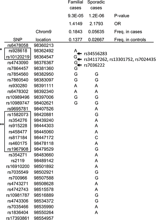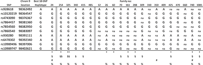 Figure 2: Families with the full or incomplete 10-SNP haplotype. §,§§, heterozygous and homozygous for rs34117262, rs13301752, rs7024435, rs7036222; *,**, heterozygous and homozygous for rs34556283; na, not available; #, families linked to the region; %, families with targeted sequencing data.