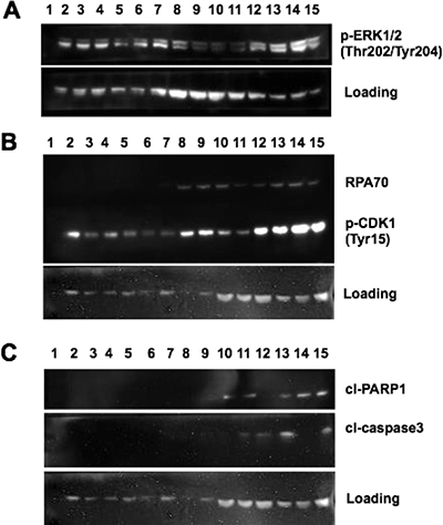 Cells were harvested and lysed in buffer (1% NP40/PBS/10% glycerol) with protease and phosphatase inhibitors. Protein concentrations were determined with Total-Protein-Assay-kit (ITSI Biosciences; K-0014-20) and then SDS sample buffer was added to the lysates. 50μg of boiled lysates were separated by SDS-PAGE and transferred onto PVDF membranes (G-Biosciences; 786-018PV). p-ERK1/2 (4370), p-CDK1 (4539), RPA70 (2267), cl-PARP1 (5625), and cl-caspase 3 (9664) primary antibodies were obtained from Cell Signaling Technologies (CST). β-actin (CST 8457) primary antibodies were used as loading controls. Anti-rabbit IgG, HRP-linked antibody (CST 7074) was used as the secondary. FemptoLUCENT Plus HRP Kit (G Biosciences; 786-003) was used as the substrate for visualization.