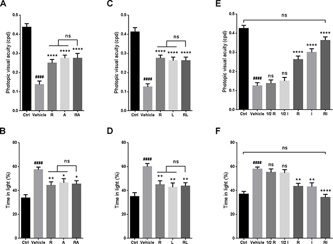 Figure 1: Synergistic effect of rasagiline and idebenone on the protection of visual function against RIR injury. (A) Photopic visual acuity of RIR-injured mice after treatment with rasagiline, ALA, or both. (B) Percent time spent in the light compartment by RIR-injured mice after treatment with rasagiline, ALA, or both. (C) Photopic visual acuity of RIR-injured mice after treatment with rasagiline, lutein, or both. (D) Percent time spent in the light compartment by RIR-injured mice after treatment with rasagiline, lutein, or both. (E) Photopic visual acuity of RIR-injured mice after treatment with rasagiline (0.05 or 0.1 mg·kg–1), idebenone (5 or 10 mg·kg–1), or both (0.05 mg·kg–1 of rasagiline and 5 mg·kg–1 of idebenone). (F) Percent time spent in the light compartment by RIR-injured mice after treatment with rasagiline (0.05 or 0.1 mg·kg–1), idebenone (5 or 10 mg·kg–1), or both (0.05 mg·kg–1 of rasagiline and 5 mg·kg–1 of idebenone). n = 8, ####p < 0.0001, versus control; *p < 0.05, **p < 0.01, ****p < 0.0001, versus vehicle; ns: no significance.